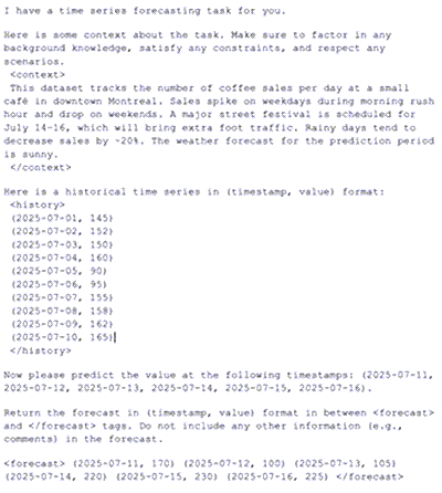 Figure 1: Example of a templated prompt for context-is-key LLM forecasting. (Source: Author)